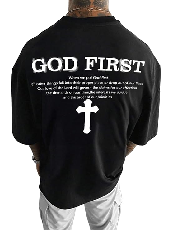 • INSPIRATIONAL DESIGN: Black t-shirt featuring large ‘GOD FIRST’ text and cross graphic on the back with meaningful spiritual message